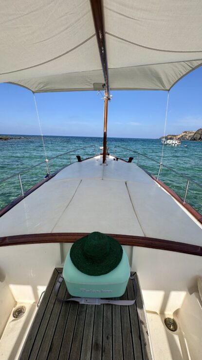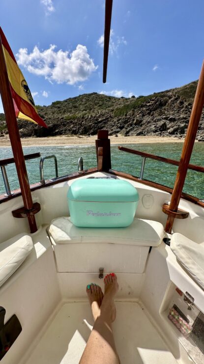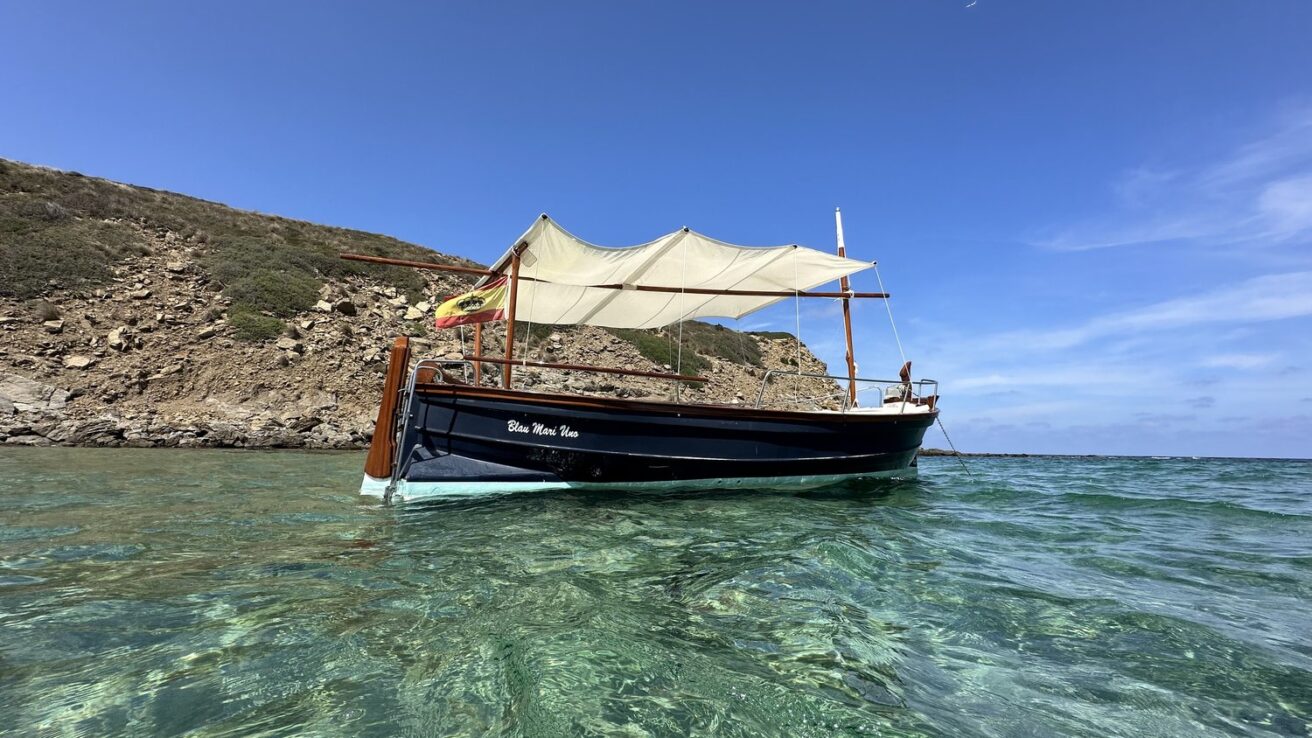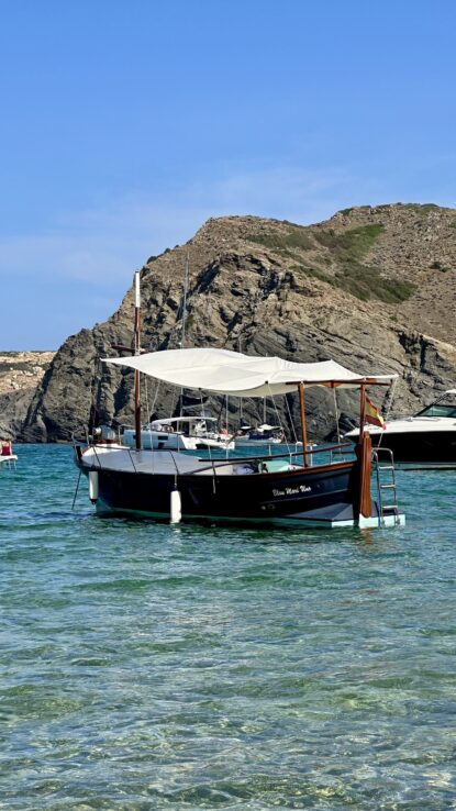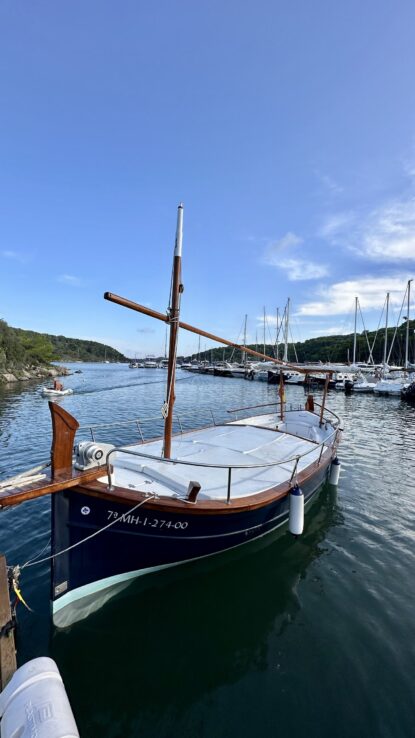 Reserva un paseo con nuestro barco tradicional menorquín más encantador, siete metros de encanto con salida desde el puerto de Addaya, ideal para salidas de 4 horas en la costa norte, amplia zona de solárium y cubierta de lota tradicional.